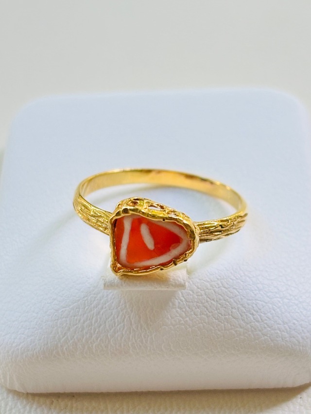 古代めのうは独特の縞模様の石です。 この石はもともとはネックレスの一部として使われていたので、穴が開いています。 ハンドメイドの繊細な金細工で、穴が見えないように、丁寧に美しく細工で装飾しています。 ■ カラー/サイズ/バリエーション 古代めのう(サイズ:12号) ■ 素材/製造国 使用素材・古代めのう(中近東)・K18金細工(タイの職人によるでハンドメイド) ■ お手入れ/取り扱い注意事項 特にお手入れは必要ありません。 ■ 発送・注文に関する情報や注意事項 商品の発送は、ご注文後3営業日以内に行います。キャンセルは発送前に限り可能ですので、詳しい規定についてはショップのルールをご確認ください。 ご不明な点がございましたら、ショップのお問い合わせからお気軽にご連絡ください。