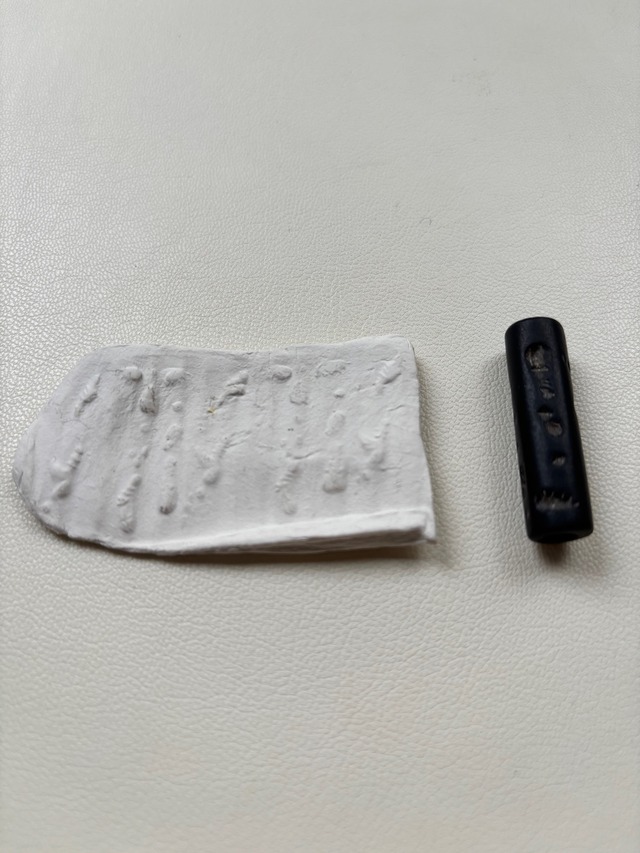 バクトリアマルギアナ時代の貴重な円筒印章です。 表面の文様が摩耗していてはっきりとは確認できませんが、人物と鳥のような ものが印刻されているようです。