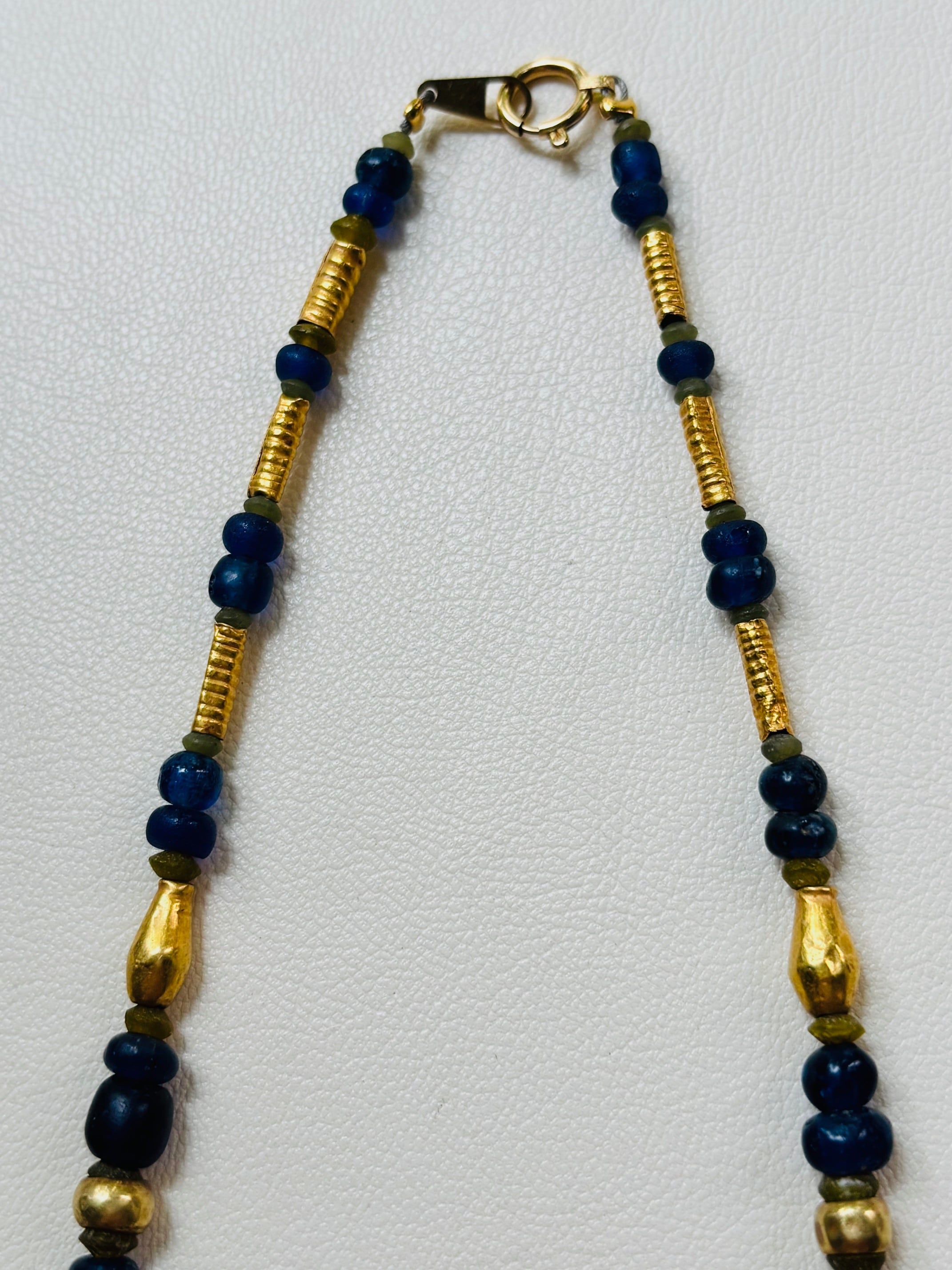 地中海沿岸出土のローマンガラス(青)と美しい古代金細工の調和したネックレスです。