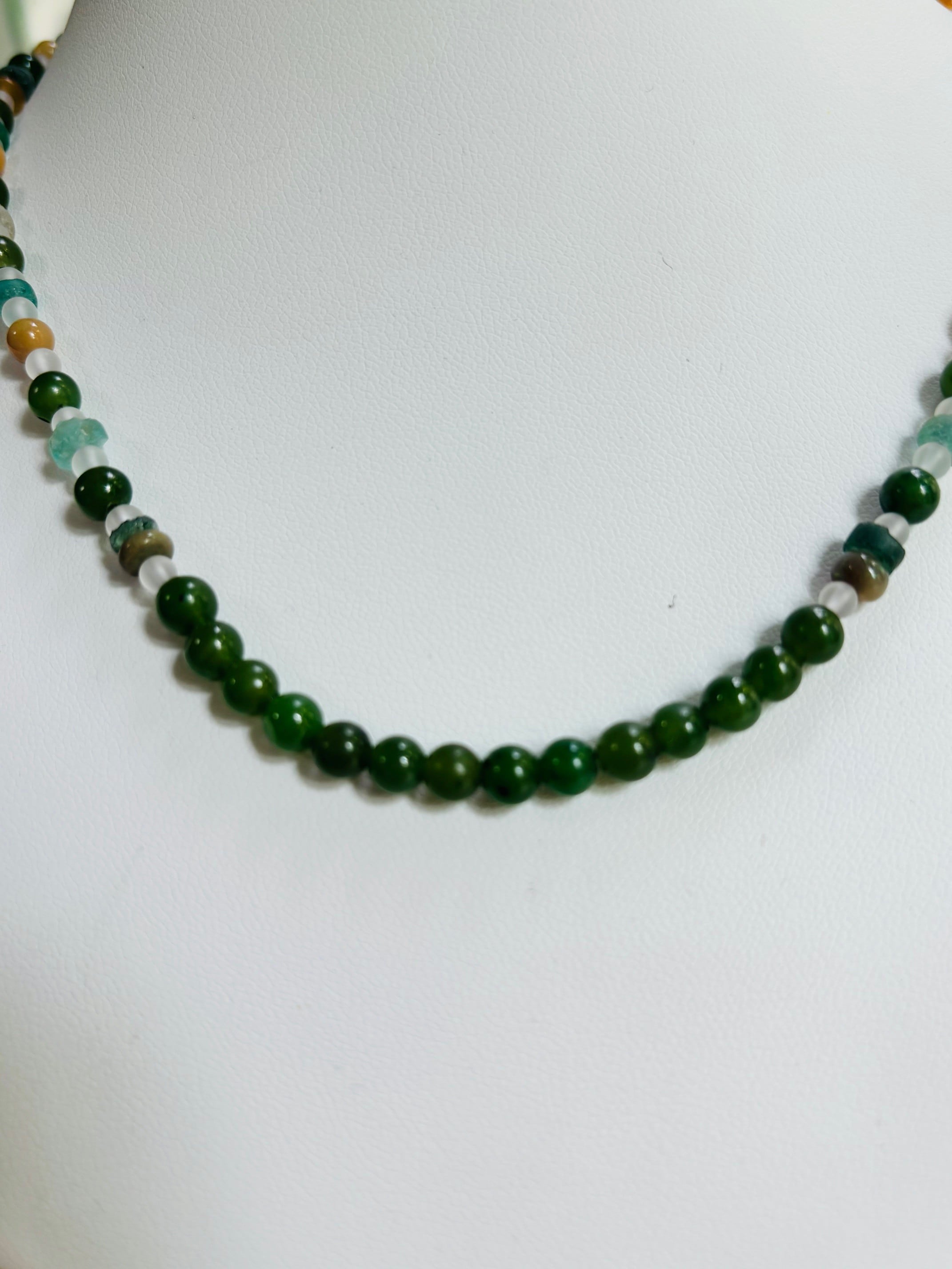 カーネリアン(赤・約0.4cm)、古代ガラス(リメイク・約0.3cm)、オパール(乳白色・最大約0.4cm)、水晶(ツヤ消し・約0.2cm)、全体の長さは約43cm(金具込み)