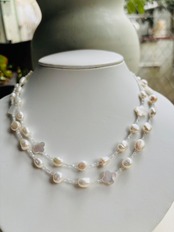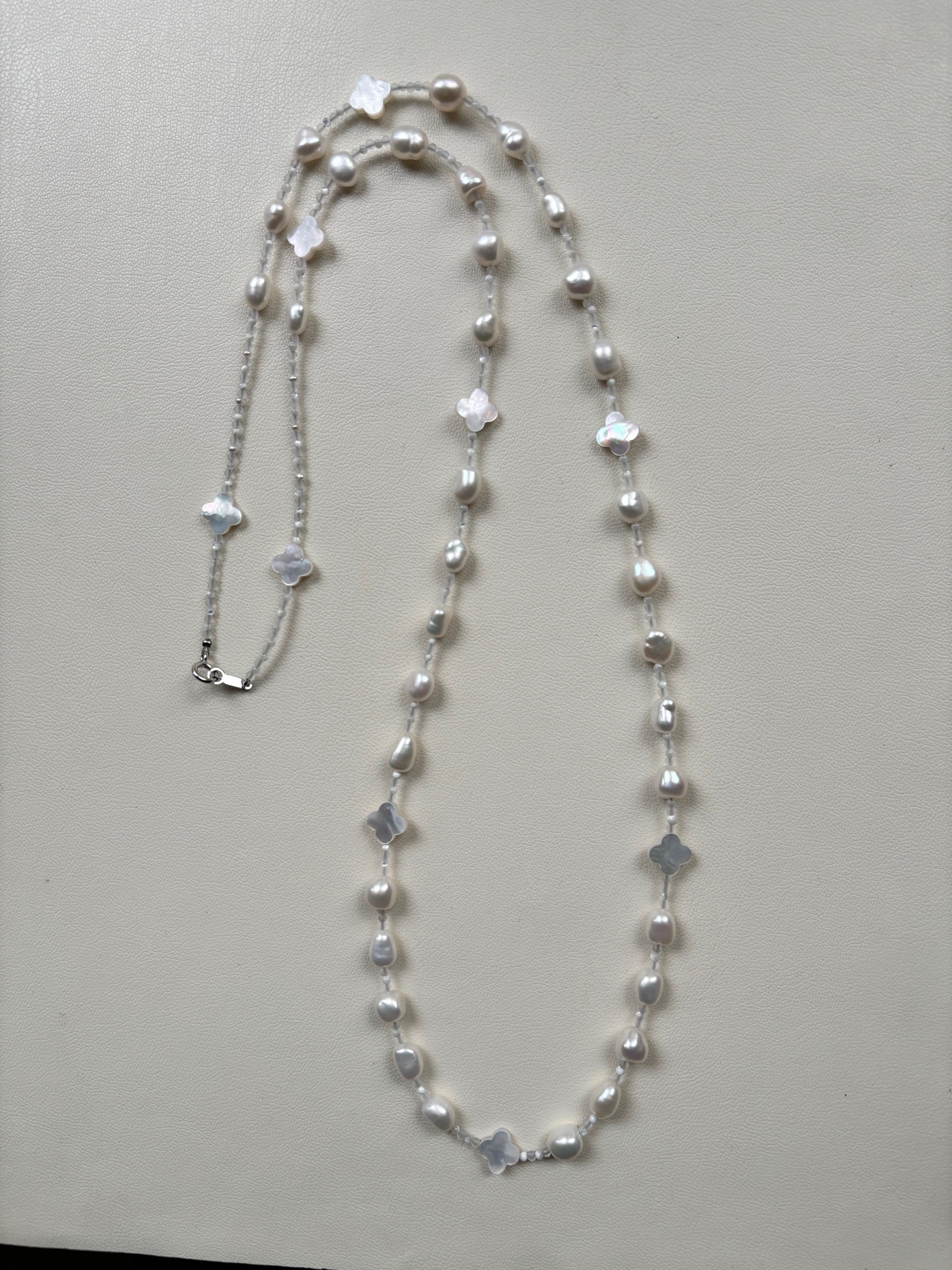 華やかな雰囲気のバロックパールとクローバー形の白蝶貝をアレンジしました。 水晶・白蝶貝ビーズは約2mmの大きさです。 そのままロングでも二連でも使えます。